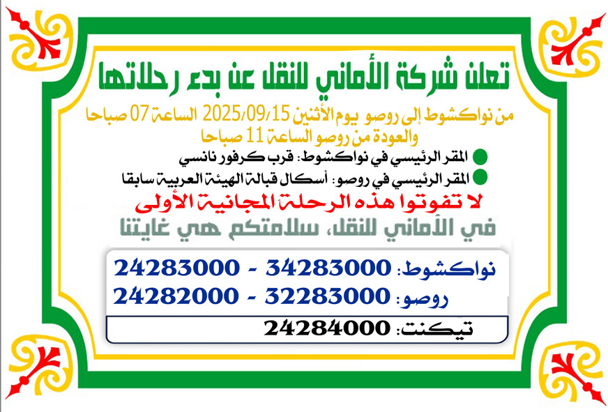 أعلنت شركة "الأماني" للنقل عن انطلاق رحلاتها بين مدينتي روصو ونواكشوط، ابتداءً من يوم غد الاثنين، وذلك في إطار تعزيز خدمات النقل بين العاصمتين السياسية والزراعية للبلاد.