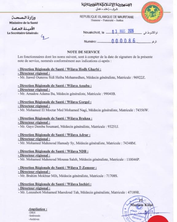 وطالت التعيينات الجديدة الإدارات الجهوية للصحة في ولايات الحوض الغربي، العصابة، كوركل، البراكنة، آدرار، داخلت نواذيبو، تيرس الزمور، وإينشيري، حيث تم إسناد المسؤوليات لعدد من الأطباء العامين.