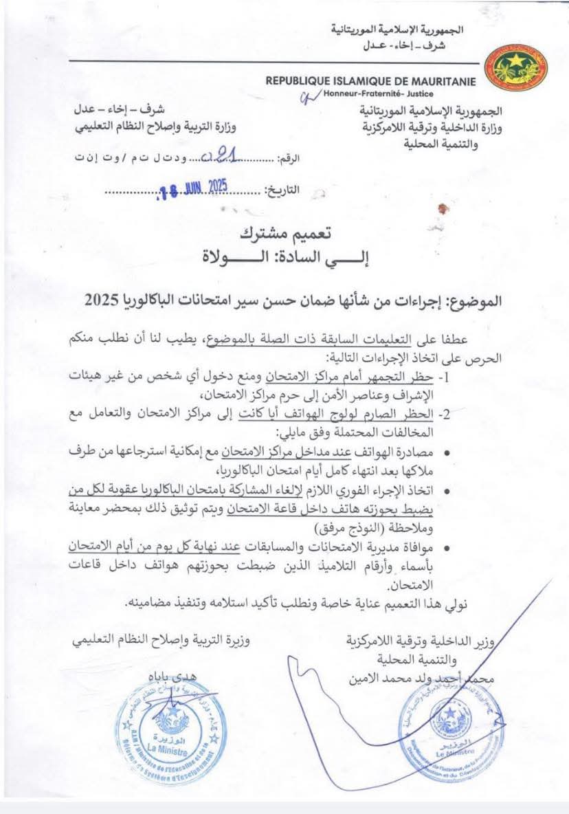 أصدرت وزارتا الداخلية والتربية بيانا مشتركا موجها إلى كافة الولاة، يقضي بمنع التجمهر أمام مراكز امتحانات الباكالوريا 2025، وفرض عقوبات على استخدام الهواتف داخل قاعات الامتحان.