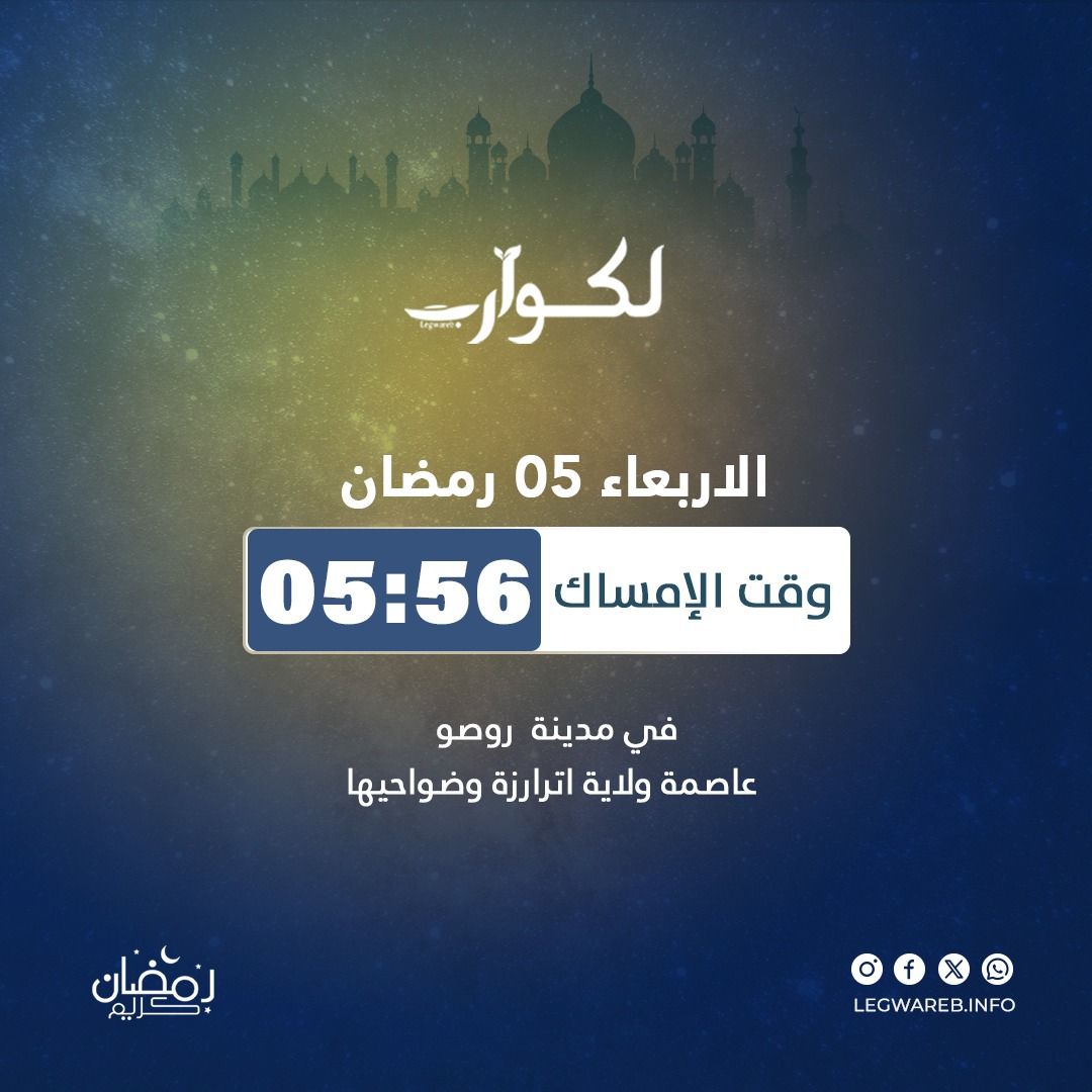 تتراوح أوقات إمساك الأربعاء الخامس من شهر رمضان 1446 في عواصم الولايات الموريتانية ما بين 05:21 دقيقة في مدينة النعمة عاصمة ولاية الحوض الشرقي، 06:01 دقائق في مدينة نواذيبو شمال غربي البلاد.