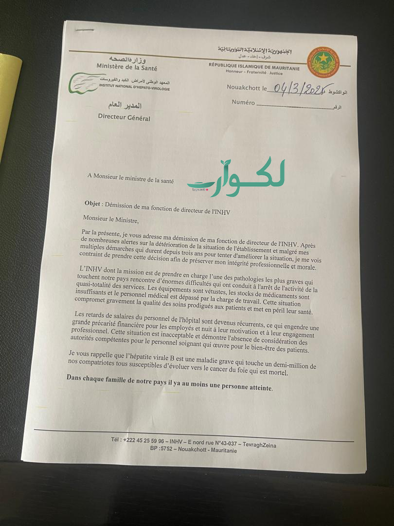 قدم المدير العام للمعهد الوطني لأمراض الكبد والفيروسات لبروفيسور المصطفى محمدو مناه استقالته لدى وزارة الصحة، وبررها بالوضعية التي تعيشها المؤسسة منذ سنوات، مؤكدا أنه راسل الوزارة بخصوصها أكثر من مرة.