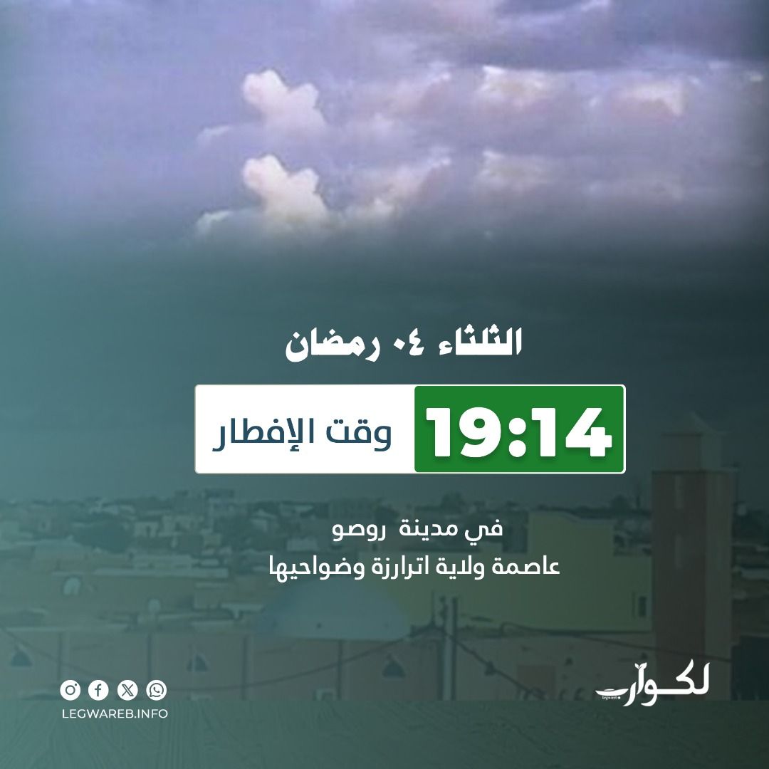 تتراوح أوقات الإفطار اليوم الثلاثاء الرابع من شهر رمضان المبارك 1446 هجرية، في عواصم الولايات ما بين 18:40 دقيقة في مدينة النعمة عاصمة ولاية الحوض الشرقي، و19:17 دقيقة في مدينة نواذيبو عاصمة البلاد الاقتصادية.