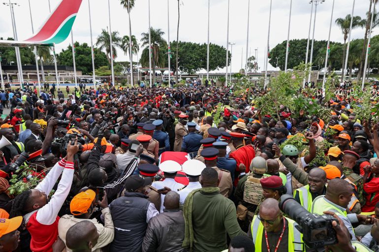 وامتلأ ملعب كرة القدم الذي يتسع لـ60 ألف شخص في العاصمة نيروبي بالمشيعين، بعد أن رافقوا الجثمان سيرا على الأقدام من المطار الرئيسي في البلاد، الواقع على بعد 29 كيلومترا.