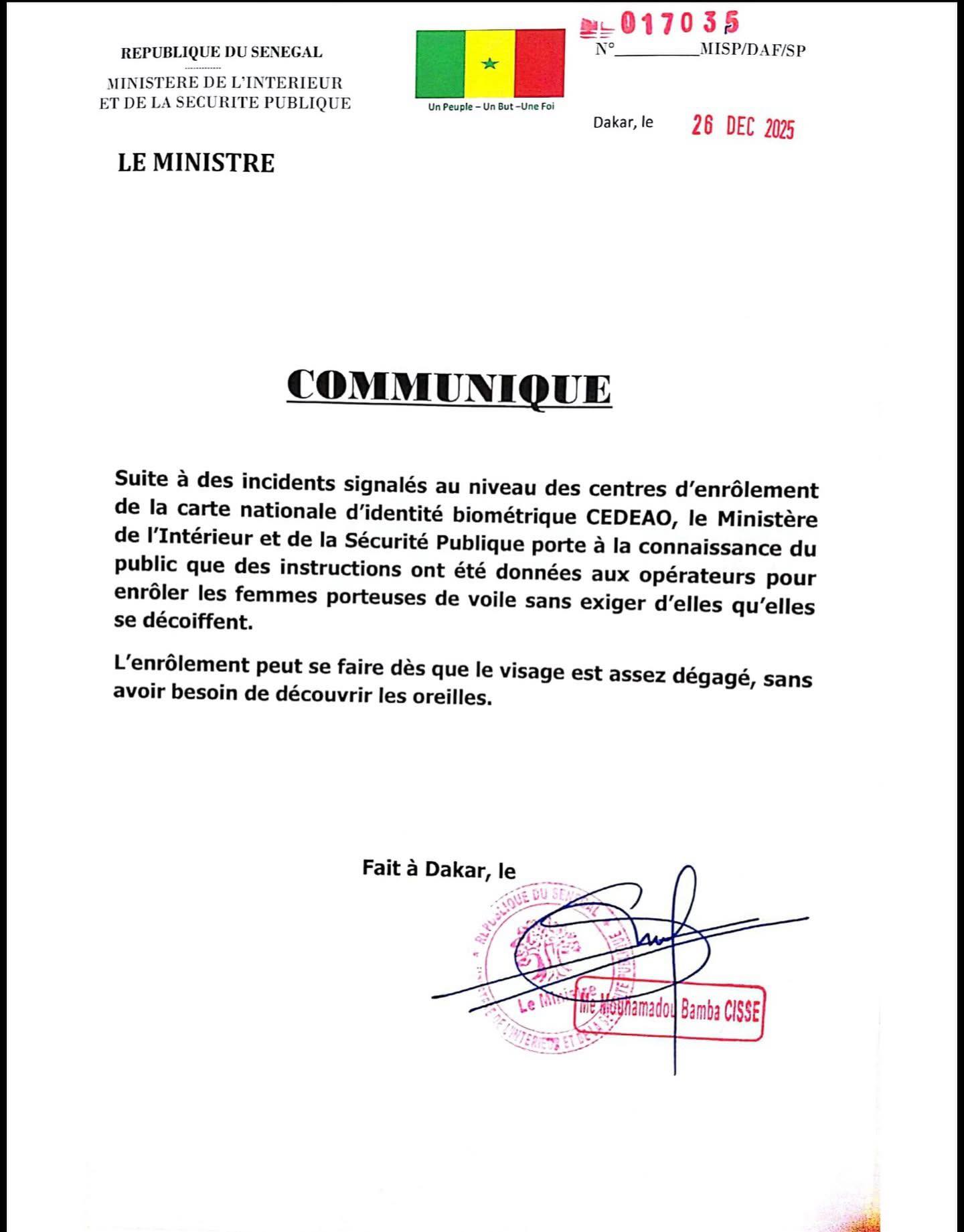 أعلنت وزارة الداخلية والأمن العام السنغالية أنه تقرر السماح بتسجيل النساء المتحجبات للحصول على بطاقات الهوية الوطنية دون إلزامهن بكشف الأذنين، وذلك عقب حوادث متكررة شهدتها مراكز التسجيل في عدد من المناطق.