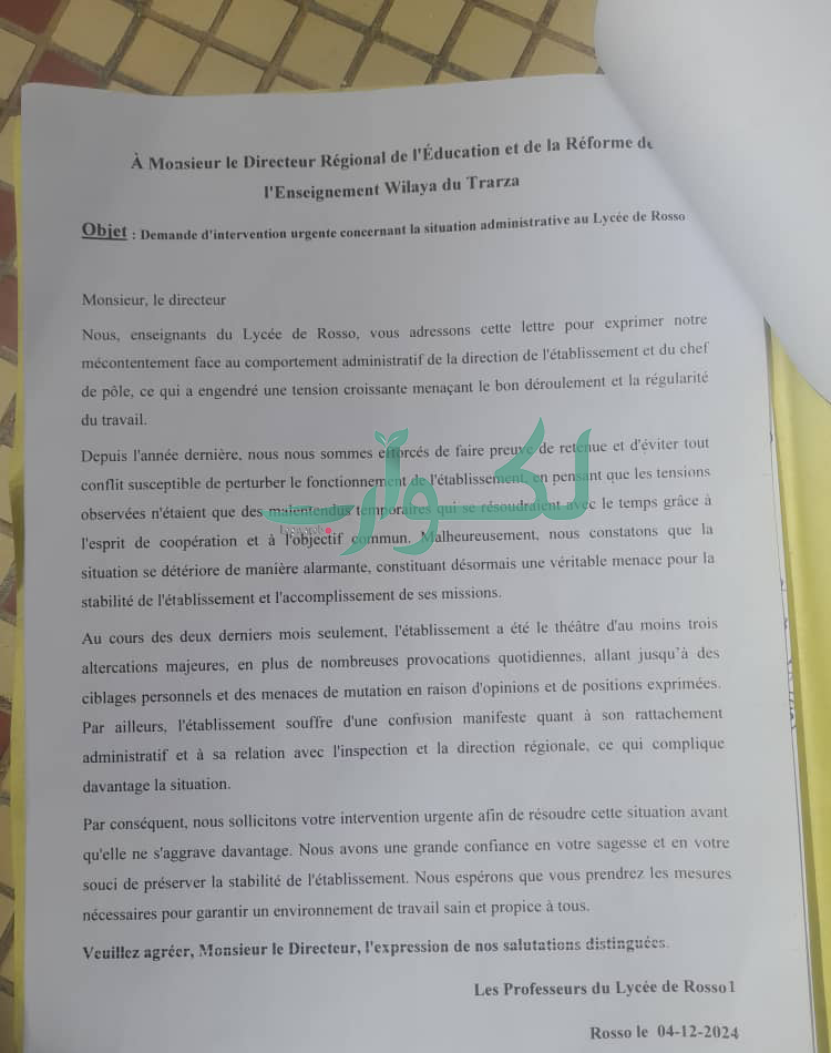وطالب الأساتذة في رسالة موجهة للمدير الجهوي للتربية وإصلاح نظام التعليم في اترارزة، أرسلت نسخة منها لـ"وكالة أنباء لكوارب"، إلى تدخل عاجل بشأن الوضع الإداري في ثانوية روصو1.