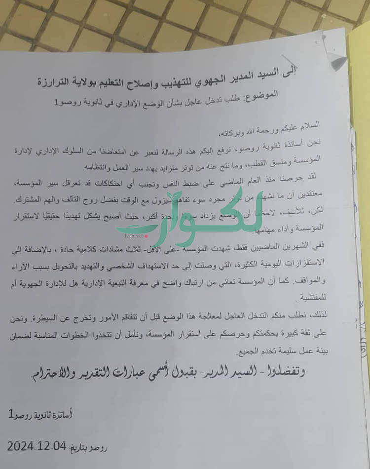 وطالب أساتذة الثانوية من المدير الجهوي التدخل العاجل لمعالجة هذا الوضع قبل أن تتفاقم الأمور وتخرج عن السيطرة، قائلين إنهم "على ثقة كبيرة بحكمتكم وحرصكم على استقرار المؤسسة ونأمل أن تتخذوا الخطوات المناسبة لضمان بيئة عمل سليمة تخدم الجميع".