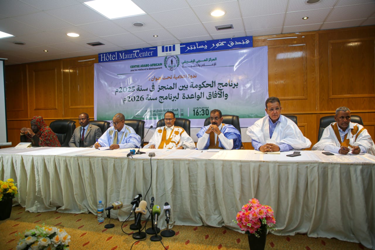 نظم المركز العربي الإفريقي للإعلام والتنمية، مساء الأحد، ندوة إعلامية في نواكشوط تحت عنوان: "برنامج الحكومة بين منجزات سنة 2025 والآفاق الواعدة لبرنامج سنة 2026"، بمشاركة نخبة من السياسيين والإعلاميين والأكاديميين وممثلي منظمات شبابية ومدنية.